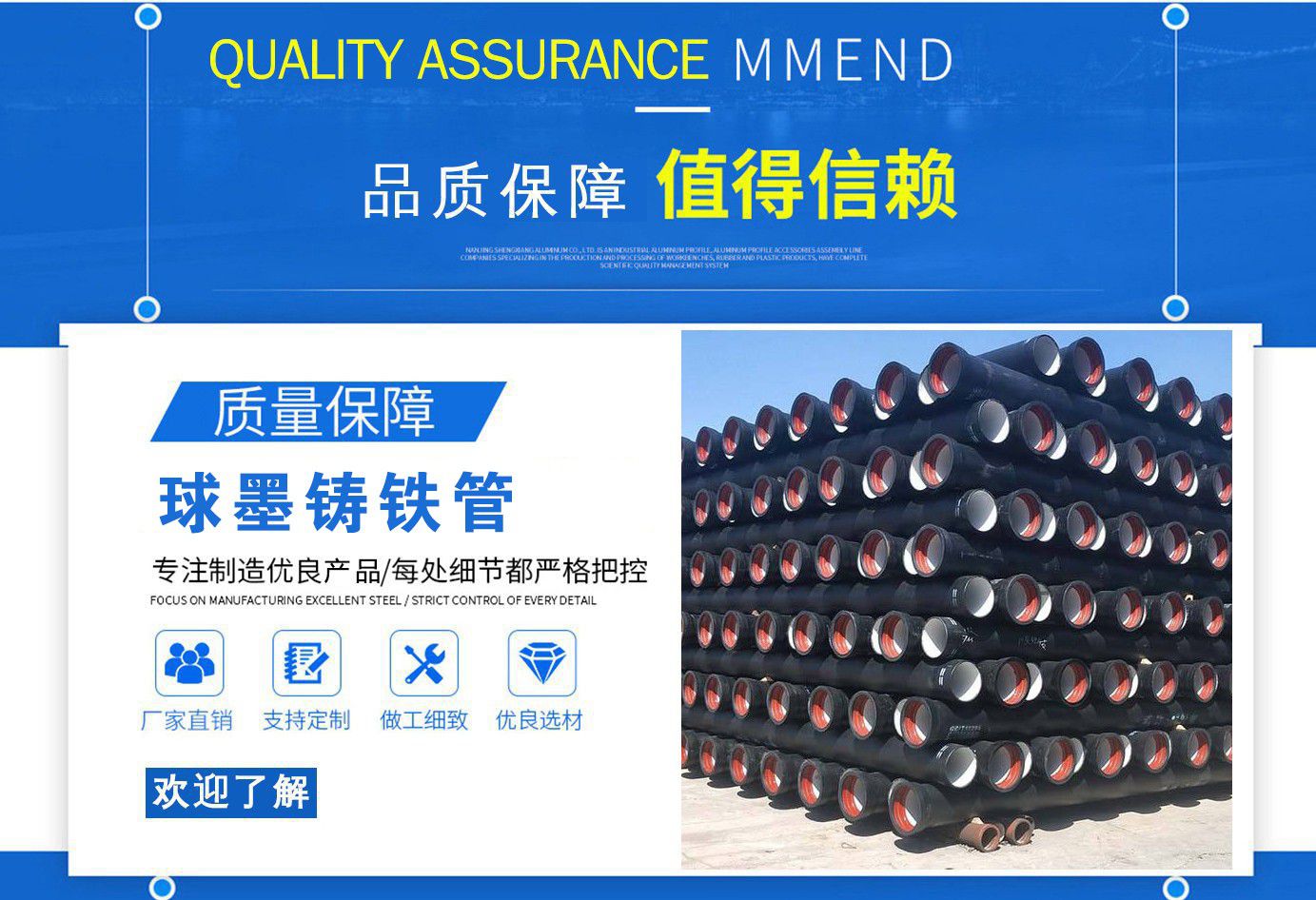 山西飛翔鑄業(yè)有限公司是一家以新興技術(shù)致力于研制開發(fā)、生產(chǎn)、銷售、施工安裝各種球墨管廠家,球墨鑄鐵管價(jià)格,國標(biāo)球墨管,k9球墨鑄鐵管,國標(biāo)球墨鑄鐵管,離心球墨鑄鐵管等系列鑄鐵產(chǎn)品。公司擁有完善的銷售、售后服務(wù)體系及一支由鑄造專家、工程師組成的精通產(chǎn)品設(shè)備和生產(chǎn)鑄造的技術(shù)力量隊(duì)伍。隨著企業(yè)的發(fā)展,我們積累了豐富的鑄造經(jīng)驗(yàn)與科技水平。使得產(chǎn)品具有高強(qiáng)度、高韌性、耐腐蝕性強(qiáng)等性能。同時(shí),我們獲得質(zhì)量管理體系認(rèn)證、產(chǎn)品質(zhì)量認(rèn)證、職業(yè)健康體系認(rèn)證、環(huán)境管理體系認(rèn)證。產(chǎn)品暢銷各地并打入韓國、新加坡等東南亞市場(chǎng)。 在未來的發(fā)展中,公司奉行誠信共雙贏,合作創(chuàng)盛世的企業(yè)理念。讓我們一起共創(chuàng)美好未來!  公司產(chǎn)品采用良好的工藝流程,以確保產(chǎn)品質(zhì)量的穩(wěn)定性:以良好的設(shè)備,確保質(zhì)量的可靠性。廣泛應(yīng)用于國內(nèi)外城市的市政建設(shè),通信,自來水,消防,園林,環(huán)保等行業(yè),產(chǎn)品大獲贊譽(yù)!  我們有多年的井蓋生產(chǎn)經(jīng)驗(yàn),多名老技術(shù)工人有將近二十年的生產(chǎn)經(jīng)驗(yàn),還聘請(qǐng)多名新技術(shù)研發(fā)人員,因?yàn)槲覀兪冀K堅(jiān)信質(zhì)量才是未來生存的根本,只有把質(zhì)量保證了,企業(yè)才會(huì)有更加美好的未來。公司堅(jiān)持用心服務(wù),誠信為本,與時(shí)俱進(jìn),科技為先的企業(yè)理念,堅(jiān)持科技先導(dǎo)、竭誠為廣大用戶服務(wù)。歡迎各界朋友蒞臨我公司參觀,指導(dǎo)洽談業(yè)務(wù),相信選擇我們就是選擇我們共贏的明天...